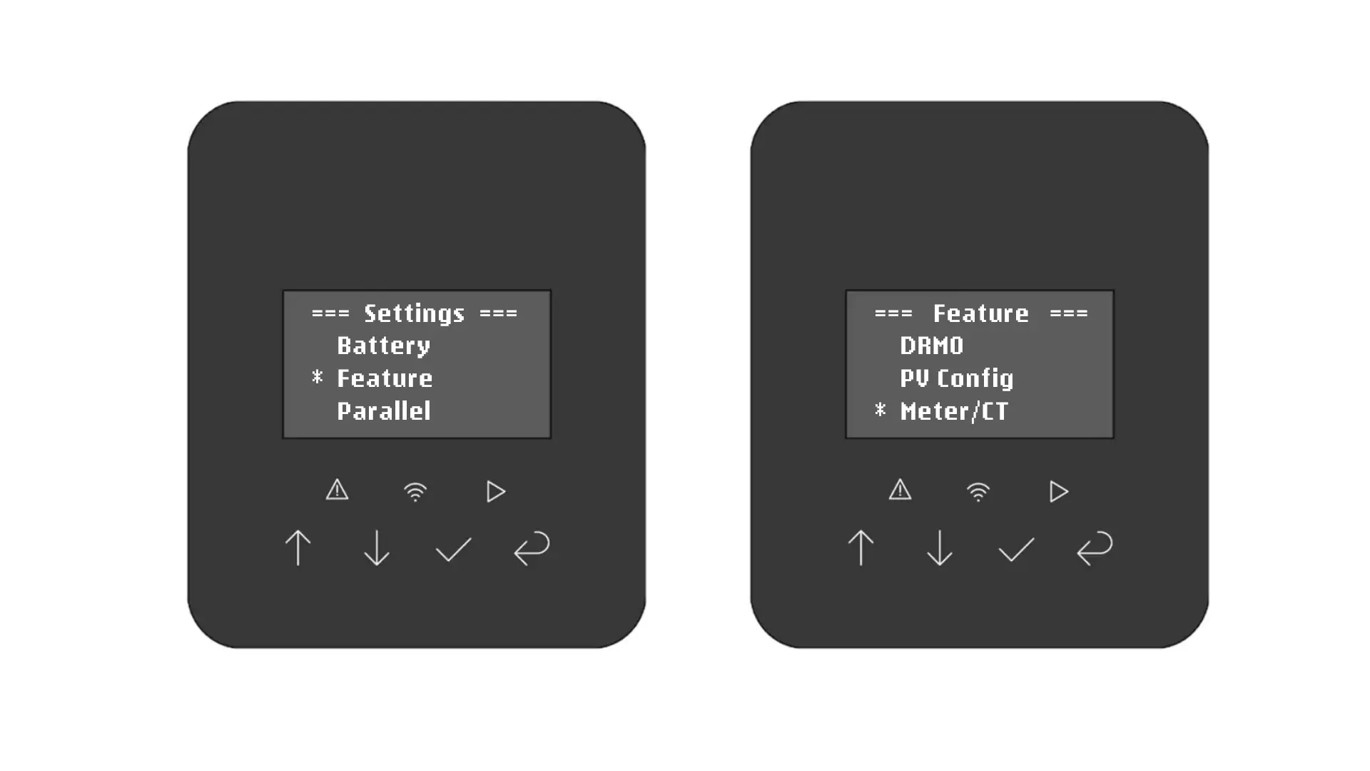 • On Inverter #2 and #3, navigate to Settings → Feature → Meter/CT