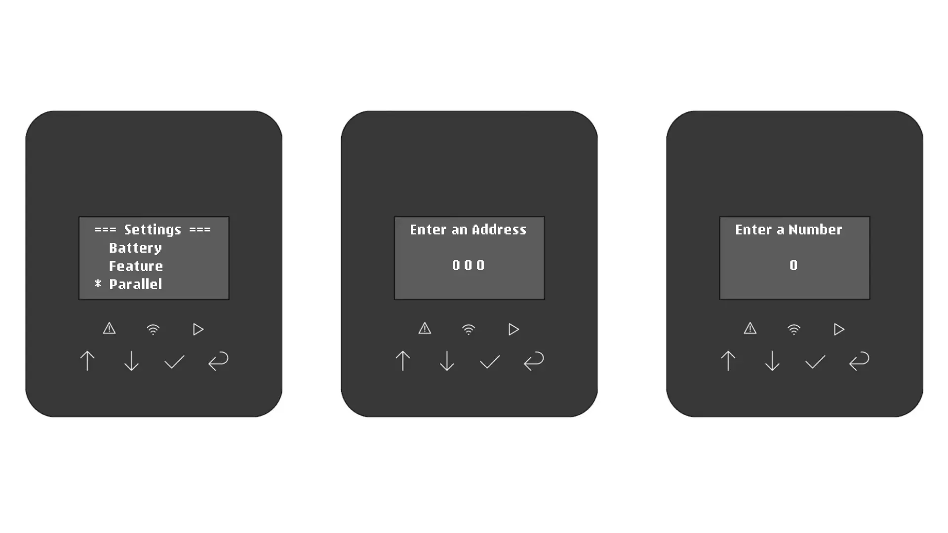 On each inverter, enable parallel mode by assigning each inverter an address and specifying the number of inverters in the cluster.